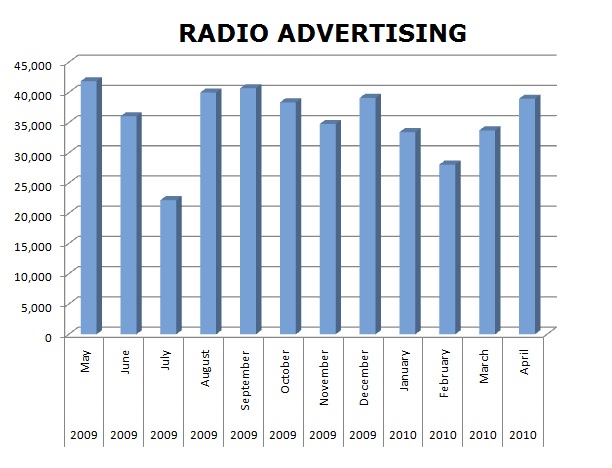 Fast food always does well on the radio with the biggest months being May, September and August. They ran 41,858 spots in May, 40,695 spots in September and 39,984 spots in August. In the last 12 months, they ran 427,217 spots on the radio.
