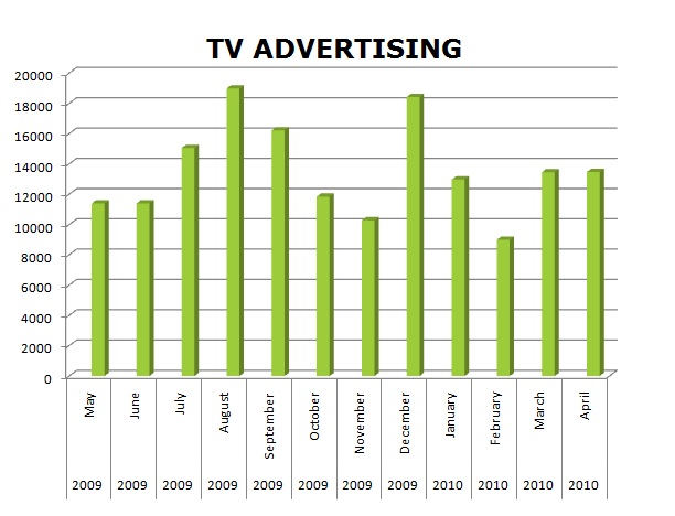 TV seems to the least media used by Burger King. They ran 162,541 spots in the last 12 months, with the biggest month being August, when they ran 18,987 spots.
