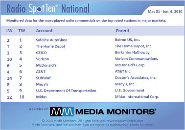 On the National level, we have a new #1: SAFELITE AUTOGLASS with 37,661 looked good last week. THE HOME DEPOT was #2 with 36,771 spots. GEICO was #3 with 32,303 spots. VERIZON bolted from #10 up to #4 with 26,299 spots, while MCDONALD’S was #5 with 26,019 ads.