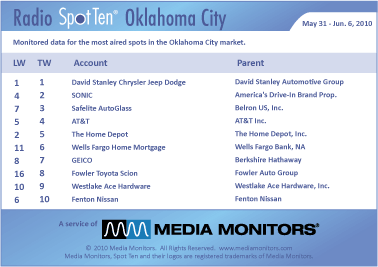 In Oklahoma City last week, the #1 advertiser was DAVID STANLEY CHRYSLER JEEP DODGE with 1,043 spots. SONIC, America’s Drive-in was #2 with 648 ads, while SAFELITE AUTOGLASS was #3 with 453 commercials. AT&T was #4 with 452 spots and THE HOME DEPOT was #5 with 435 spots. WELLS FARGO HOME MORTAGE was up from #11 to #6 with 385 spots, while GEICO was in at #7 with 356 spots. FOWLER TOYOTA SCION jumped #16 to #8 with 355 spots. WESTLAKE ACE HARDWARE was #9 with 345 ads and FENTON NISSAN was #10 with 345 spots.
