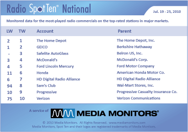 THE HOME DEPOT blasts back on top with 50,697 ads nationally. GEICO was very strong at #2 with 48,639 spots. SAFELITE AUTOGLASS was back at #3 with 45,989 spots, while MCDONALD’S was #4 with 25,406 spots. Coming in #5 was FORD LINCOLN MERCURY with 23,005 spots.