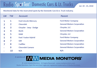 Ford just announced their best quarter with profits up 13%. This week, the Domestic Cars & Truck Spot Ten was only nine, with FORD LINCOLN MERCURY on top with 23,005 spots. CHEVROLET (GM) was #2 with 8,817 spots, while CHRYSLER JEEP DODGE was #3 with 5,417 ads. BUICK (GM) was #4 with 4,751 commercials and RAM (Chrysler Truck) was #5 running 1,269 spots. FORD FUSION HYBRID was #6 with 710 spots, while GM was #7 airing 560 announcements. CADILLAC (GM) was #8 with 458 spots and CHEVROLET CAMARO was #9 with 4 spots.