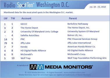 In the Washington, DC market the #1 radio advertiser was GEICO with 1,004 spots. Coming in #2 was THE HOME DEPOT with 790 commercials, while the UNIVERSITY OF MARYLAND was #3 running 769 spots. SAFELITE AUTOGLASS was #4 airing 689 announcements and PNC was #5, up from #14, with 666 ads. JIFFY LUBE was #6, coming up from #79, with 616 spots, while HONDA was #7 with 610 ads. The HD DIGITAL RADIO ALLIANCE was #8 with 522 announcements and MCDONALD’S was #9 with 447 spots. Coming in at #10 was WOLF TRAP (Performing Arts Center) with 412 spots.