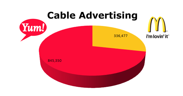 Yum more than doubles McDonald’s on Cable with 945,350 to Mickey D’s 336,477 spots in the last 12 months.