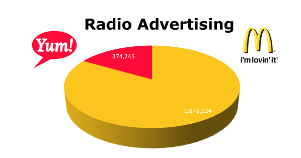 On Radio, McDonald’s is the king with 1,875,124 spots against Yum Brands’ 374,245 ads.