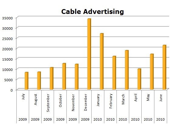In the last 12 months, American Express has run 196,757 spots on Cable. The biggest month was December (holiday spending) with 34,178 spots.
