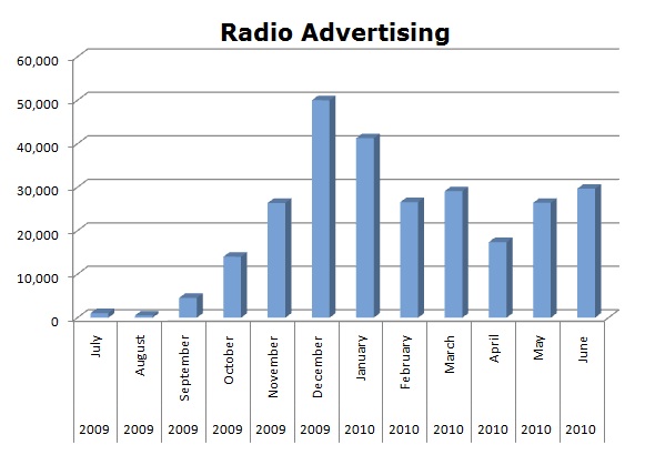 American Express ran most of their spots on Radio, to the tune of 267,076 in the last 12 months. Again, December was the biggest month with 50,017 spots and then more in January, 41,295 ads.