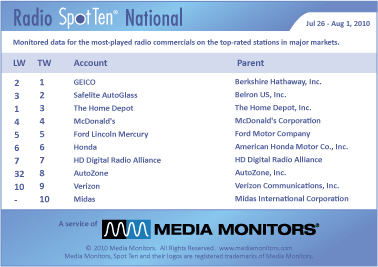 GEICO leaps back into #1 with 48,565 spots. SAFELITTE AUTOGLASS hits #2 with 42,210 ads, while THE HOME DEPOT moves down to #3 with 28,696 commercials. MCDONALD’S was #4 with 25,047 spots and FORD LINCOLN MERCURY was #5 with 24,013 spots. NOTE: HONDA was #6 with 23,606, TOYOTA was #16 with 10,690, Chevrolet was #19 with 8,349 ads. And BP was #24 with 9,163 spots.