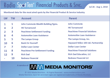 In the category of financial products, the #1 advertiser was JOHN CUMMUTA with 4,733 spots pitching his Wealth Building Programs. #2 in the nation was HK TURNAROUND with 1,395 spots. PEACHTREE SETTLEMENT FUNDING was #3 with 1,298 spots, while AUTOMOTIVE LOAN ASSISTANCE was #4 airing 851 announcements. THE LAMPO GROUP was #5 with 807 spots and BANK ON YOURSELF was #6 running 711 commercials. DOLLAR LOAN CENTER was #7 with 578 spots and PEACHTREE PRE-SETTLEMENT FUNDING was #8 with 501 spots. RICH DAD played 412 times to land #9, while REDNESS FINANCIAL was #10 with 375 spots.