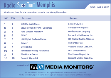In Memphis last week the #1 advertiser was SAFELITE AUTOGLASS with 556 ads. STEVE COHEN FOR US CONGRESS was #2 with 481 spots, while FORD LINCOLN MERCURY was #3 with 472 commercials. GEICO was #4 running 468 spots and the HD DIGITAL ALLIANCE was #5 with 387 announcements. KROGER was #6 with 381 spots, while GOSSETT KIA was #7 running 352 spots. TENNESSEE VALLEY AUTHORITY was #8, up from #93, with 293 announcements and THE HOME DEPOT was #9 airing 272 spots. GOSSETT HYUNDAI was #10 with 262 spots.