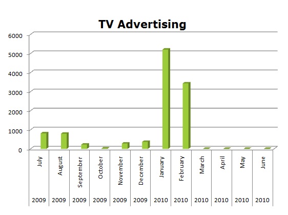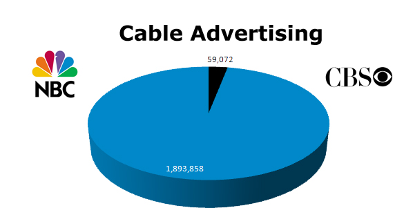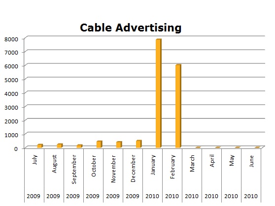NBC TV seems to have a greater investment in Cable to promote their TV shows. With NBC’s 1,893,858 spots on cable in the last 12 months, they tower over CBS that only has 59,072 spots. The biggest months for CBS were September and November, while NBC started biggest January with 195,894 which might have been their ramp up for the 2010 Winter Olympics.