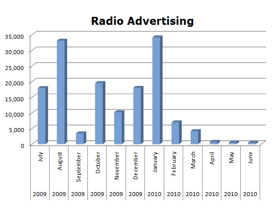 In Radio, the picture is brighter, with a big blast last August with 33,107 spots, then another strong flight in January of 34,171 spots. March dropped to 4,180, then to levels under 800 spots since April. We will see if they rebound.