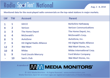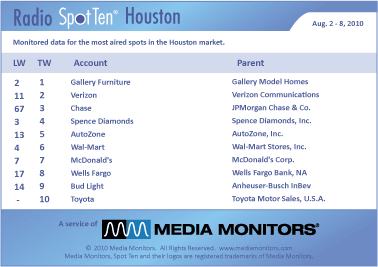 The #1 radio advertiser in Houston last week was GALLERY FURNITURE with 855 spots. Coming in #2, was VERIZON with 801 ads, while CHASE was #3, up from #67, with 635 commercials. SPENCE DIAMONDS shined at #4 with 609 spots and AUTOZONE hit #5 with 542 spots. WAL-MART was #6 airing 537 spots, while MCDONALD’S was #7 running 508 spots. WELLS FARGO jumped to #8 with 460 ads and BUD LIGHT was #9 with 451 commercials. Coming in #10 was TOYOTA with 443 spots.