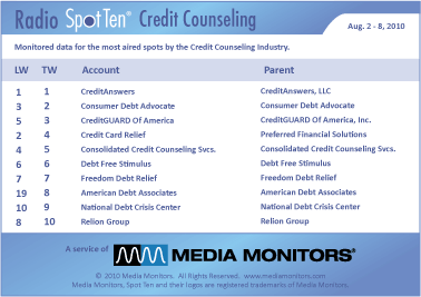 In the USA last week, CREDITANSWERS was #1 in this category with 5,621 ads. CONSUMER DEBT ADVOCATE was #2 with 3,895 spots, while CREDITGUARD OF AMERICA was #3 airing 2,992 commercials. CREDIT CARD RELIEF was #4 with 2,941 ads and CONSOLIDATED CREDIT COUNSELING SERVICES was #5 running 2,926 spots. DEBT FREE STIMULUS was #6 with 2,360 ads, while FREEDOM DEBT RELIEF was #7 airing 2,133 spots. AMERICAN DEBT ASSOCIATES jumped #19 to #8 with 1,857 ads and NATIONAL DEBT ASSOCIATES was #9 with 1,699 spots. RELION GROUP was #10 with 1,507 spots.