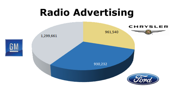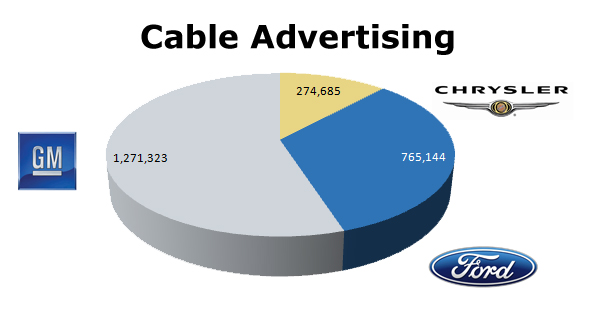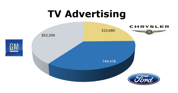 GM was #1 on the stations Media Monitors follows with 852,506 commercials in the last 12 months, while Ford played 749,478 spots in the last 12 months. Chrysler came up 3rd on TV with 523,690.