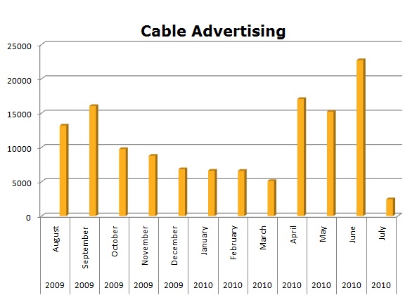 Visa ran 130,351 spots on the Local Cable Media Monitors tracks. After a slow beginning of the year, they cranked it up in April with 17,053 spots, then to 15,203 in May; jumping to 22,713 in June. The July numbers were only 2,454 on Cable.
