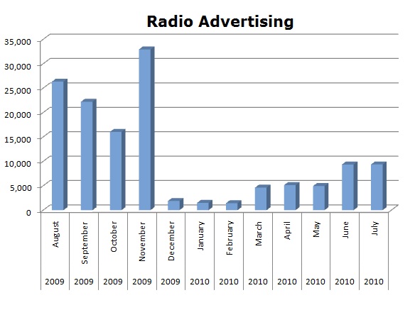 On Radio, they were hot last August with 26,327, 22,200 in September, 16,031 in October; then back up in November with 32,928 ads. The rest of the last 12 months have been light on radio. They haven’t gotten up past the 10,000 mark this year and only running 135,644 ads in the last 12 months on radio.