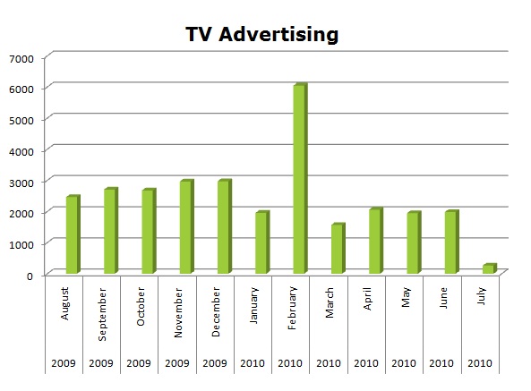 TV is more consistent, but light. In February they ran 6,048 spots with a total of only 29,612 in the last 12 months.