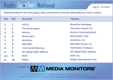The #1 advertiser on the radio last week in San Diego was CHASE with 1,212 spots. Coming in #2 was DC LABS (Hair Products) with 931 ads, while GEICO jumped from #27 up to #3 with 779 spots. MCDONALD’S was #4 with 679 commercials and VERIZON was #5 airing 640 announcements. U.S.BANK was #6 running 565 spots, while MATTRESS DISCOUNTERS WEST was #7 with 553 ads. BANKRUPTCY LAW CENTER laid claim to #8 and AT&T soared from #20 to #9 with 532 spots. SHARP HEATHCARE was #10 airing 502 spots.