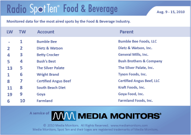 In the category of Food and Beverages the #1 advertiser is BUMBLE BEE with 2,584 spots nationwide. DIETZ & WATSON is #2 with 1,046 ads, while BETTY CROCKER was #3 with 553 commercials. BUSH’S BEST was #4 with 400 spots and THE SILVER PALATE was #5 with 270 ads. WRIGHT BRAND (Tyson Foods) was #6 airing 251 announcements, while CERTIFIED ANGUS BEEF was #7 with 250 spots. SOUTH BEACH DIET was #8 with 178 spots, while GOYA was #9 with 150 spots. And coming in #10 was FARMLAND with 147 spots.