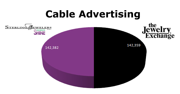 In all the time we’ve been doing the Competitive Face-Off feature, we have never seen two companies closer in ad buys for any media. In Cable, Sterling Jewelers ran 142,382 to the Jewelry Exchange’s 142,359 spots. Only 23 spots separate these two giants in the diamond business on Cable.