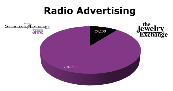 On Radio, Sterling Jewelers ran 204,059 spots in the last 12 months, against the Jewelry Exchange with only 24,130 spots. Logically, Sterling’s biggest months were November with 44,583 ads, and then December with 33,917 spots.
