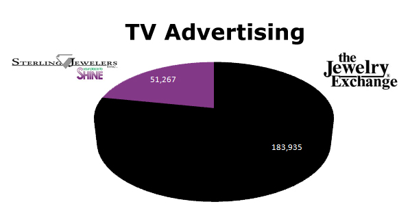 On TV, the Jewelry Exchange outshines Sterling. The Jewelry Exchange ran 183,935 ads, while Sterling Jewelers ran 51,267 in the last 12 months. In November, the Jewelry Exchange ran 20,942 ads on TV, and then 28,218 spots in December.