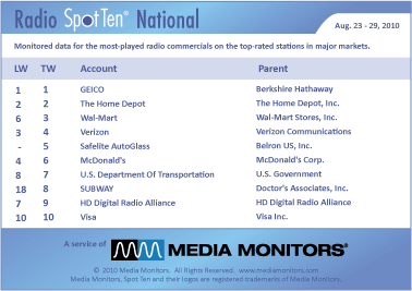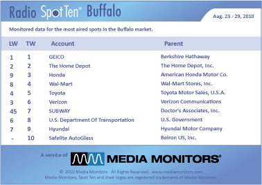In Buffalo last week, GEICO was king of the hill with 768 spots. THE HOME DEPOT came in #2 running 547 spots, while HONDA was #3 airing 348 announcements. WAL-MART was #4 with 321 spots and TOYOTA was #5 with 315 ads. VERIZON was #6 with 289 spots, while SUBWAY was #7, up from #45, running 280 spots. The US DEPARTMENT OF TRANSPORTATION was #8 with 275 spots and HYUNDAI was #9 airing 272 ads. And coming in #10 was SAFELITE AUTOGLASS with 270 spots.