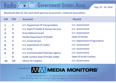 The #1 advertiser in this category is the US DEPARTMENT OF TRANSPORATION with 23,396 spots (Anti-Drunk Driving Campaign). Coming in #2 was the US DEPARTMENT OF HEALTH & HUMAN SERVICES with 9,860 announcements, while the ARMY NATIONAL GUARD spent 7,003 spots for recruitment to come in #3. The FLORIDA DEPARTMENT OF HEALTH was #4r and ran 3,260 spots. The US FOREST SERVICE was #5 with 1,743 spots, while US DEPARTMENT OF JUSTICE ran 1,524 spots to come in #6. The US ARMY marched into #7 with 1,377 spots and the US ENVIRONMENTAL PROTECTION AGENCY was #8 with 1,376 spots. SOUTH CAROLINA DEPARTMENT OF PUBLIC SAFETY aired 1,247 announcements to come in #9 and the LIBRARY OF CONGRESS was #10 with 1,087 spots.