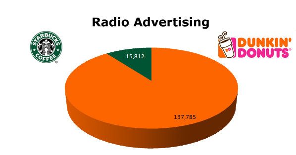 On Radio, Starbucks was totally decaf with only 15,812 spots in the last 12 months compared to Dunkin’s 137,785 spot schedules. Dunkin’ Donuts were hot in December (15,931) and June (16,910), while Starbucks only had three months over 2,000 spots; they were September, March and April.