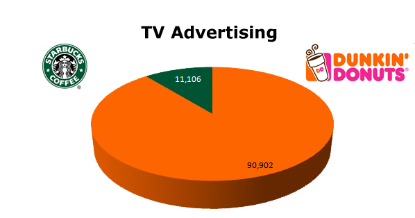 On TV, Starbucks only ran 11,106 spots in the last 12 months, while Dunkin’ Donuts ran hotter with 90,902 spots. Dunkin’ hit 11,768 spots in March and 10,424 in May, while Starbucks was in single digits in August, November, January, February and March.
