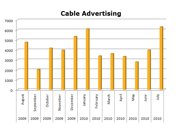 On Cable, Dunkin’ Donuts leads with 69,513 ads to Starbucks’ 45,665 in the last 12 months. September was Dunkin’ Donuts’ big month with 14,009, while Starbucks excelled in June with 19,414 ads.