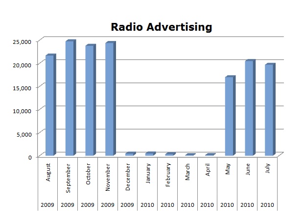 On the Radio, Boniva hit hard with 153,251 spots in the last 12 months. They seemed to have taken a break from December to April, but then came back on this May with 16,985 spots, and then June with 20,473 commercials and July ran 19,678 spots.