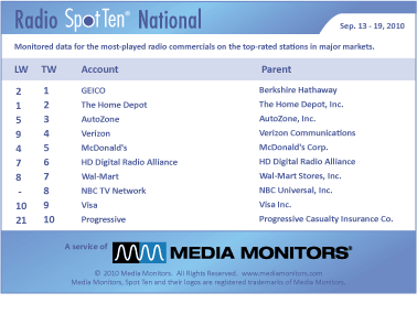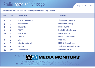 Last week in the Windy City the #1 advertiser on the radio was THE HOME DEPOT with 1,346 spots. MCDONALD’S was #2 running 1,055 ads, while MENARDS was #3 with 920 commercials. GEICO was #4 with 881 spots and AUTOZONE jumped from #15 to #5 airing 861 announcements. LOWE’S was #6 with 789 spots, while VISA hit lucky #7 with 763 ads. NBC-TV NETWORK appeared at #8 with 705 spots and VERIZON rung up #9, from #21, with 685 spots. JEWEL-OSCO was #10 with 665 spots.