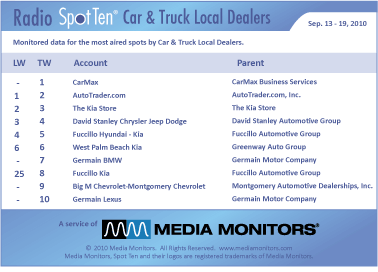 In this category, CARMAX was king with 4,378 spots. AUTOTRADER.COM was in at #2 with 3,104 spots and THE KIA STORE was #3 airing 1,163 spots. DAVID STANLEY CHRYSLER JEEP DODGE (Oklahoma City, OK) was #4 with 1,025 spots, while FUCCILLO HYUNDAI-KIA (upstate New York) was #5 with 986 spots. WEST PALM BEACH KIA was #6 running 772 spots and GERMAIN BMW (Naples, FL) was #7 with 746 spots. FUCCILLO KIA was #8 with 714 spots, while MONTGOMERY AUTOMOTIVE DEALERSHIPS, INC. landed in #9 with 640 spots. And coming in #10 was GERMAIN LEXUS with 635 spots.