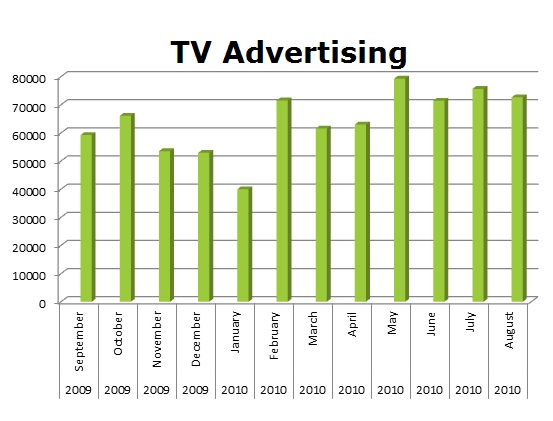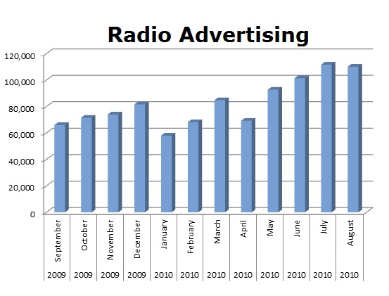 On Radio, Ford shifted gears in April and has been pouring it on ever since. They ran 989,426 commercials in the last 12 months, with June, July and August all being over 100,000. July alone was 111,685 spots.