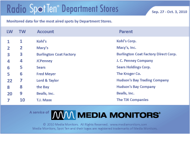 KOHL’S is king this week with 17,667 spots making them #1. MACY’S was #2 running 15,324 commercials, while BURLINGTON COAT FACTORY wrapped up #3 with 2,380 spots. JCPENNEY was #4 airing 2,039 announcements and SEARS landed in #5 with 1,200 spots. FRED MEYER was in at #6 with 1,198 spots, while LORD & TAYLOR jumped from #22 to #7 with their 566 spots. THE BAY hit #8 with 532 spots and BEALLS, INC was #9 running 508 spots. And coming in #10 in the Department Store category last week was T.J.MAXX with 285 spots.