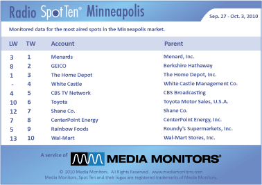 Last week in the Twin Cities the #1 radio advertiser was MENARDS with 577 ads. GEICO was #2 airing 542 announcements, while THE HOME DEPOT slotted in #3 with 500 spots. WHITE CASTLE was #4 running 420 spots and CBS TV NETWORK was #5 with 410 spots. TOYOTA was #6 366 commercials, while SHANE COMPANY was #7 with 348 spots. CENTERPOINT ENERGY was #8 with 348 spots and RAINBOW FOODS was #9 with 343 spots. WAL-MART climbed from #13 to #10 with 330 spots.