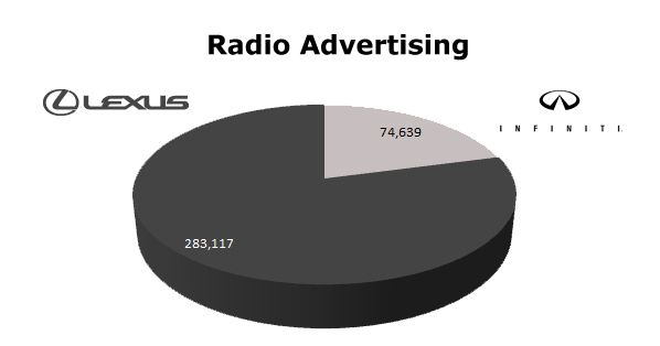 On Radio, Infiniti aired only 26.4% as many spots as Lexus. Lexus came in with 283,117 spots and Infiniti hit 74,639 ads.