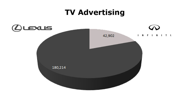 On TV, Infiniti only aired about 23% as many ads as Lexus. Lexus cleared 180,214 spots, while Infinite played 42,902 times.