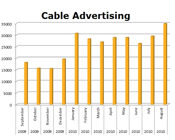 On Cable, Taco Bell placed 303,219 spots in the last 12 months. They started out strong in the beginning of this year running 30,693 spots in the first month; and beating that total in August with 34,908 spots.