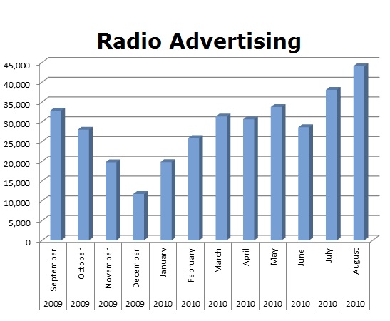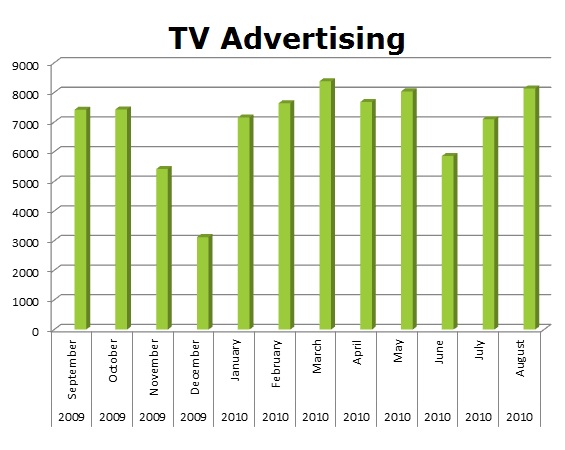 Radio was their strongest media with 344,356 ads in the last 12 months. Last month they ran the biggest total of 44,034 for August.