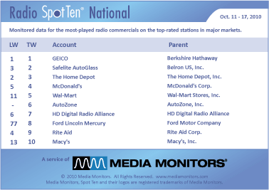 On the National front, GEICO maintains the #1 position with 48,813 spots. SAFELITE AUTOGLASS jumps from #3 to #2 with 30,630 spots. THE HOME DEPOT was #3 with 26,449 ads, while MCDONALD’S was #4 with 25,344 commercials. WAL-MART was #5, up from #11, with 24,481 spots.