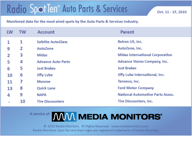 In the category of Automotive Pars & Services SAFELITE AUTOGLASS comes in #1 with 30,630 spots for the week. AUTOZONE was #2 with 21,849 spots, while MIDAS connected at #3 with 9,952 ads. ADVANCE AUTO PARTS was #4 with 4,186 commercials and JUST BRAKES stopped at #5 with 2,853 spots. JIFFY LUBE slid into #6 with 1,701 spots and MONROE shocked the country from #11 up to #7 with 1,566 spots, while QUICK LANE moved from #13 to #8 with 1,563 spots. NAPA dropped from #4 to #9 running 1,395 spots and TIRE DISCOUNTERS was #10 running 1,050 spots.