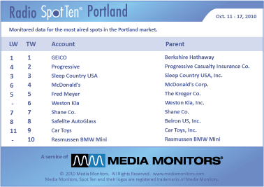 In Portland last week GEICO was the #1 advertiser on the radio with 687 spots. PROGRESSIVE was #2 airing 661 ads, while SLEEP COUNTRY USA was #3 with 610 spots. MCDONALD’S was #4 with 576 commercials and FRED MEYER was #5 running 545 spots. In at #6 was WESTON KIA with 532 spots, while SHANE COMPANY was #7 airing 525 announcements. SAFELITE AUTOGLASS was #8 with 252 spots as well, and coming in #9 was CAR TOYS with 485 ads. RASMUSSEN BMW MINI was #10 with 477 spots.