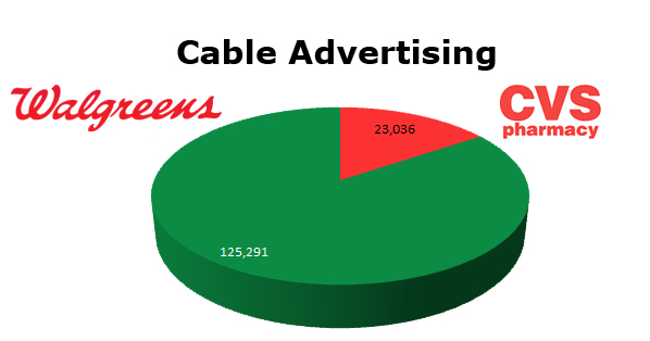 On Cable, Walgreens trampled CVS with their 125,291 to CVS’ 23,036 for the last 12 months. CVS ran only 18.4% as many spots as Walgreens.