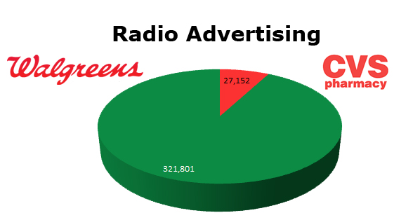 On the Radio, Walgreens once again out performed CVS. Walgreens ran 321,801 commercials to CVS schedule of only 27,152 ads. That was only 8.4% as many spots.