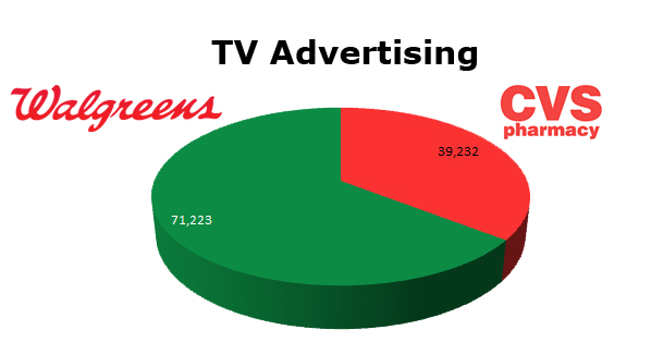 On TV, they get a bit closer with Walgreens running 71,223 spots to CVS with 39,232 spots.