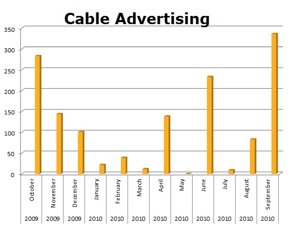 The biggest months for Panera on Cable were September, October and June. They ran a total of 1,400 spots in the last 12 months.