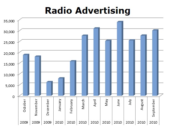 Thanks to Panera for delivering the bread to radio with 268,512 spots in the last 12 months. The biggest month was June with 33,976 spots and the lowest month was last December with 6,312 ads.